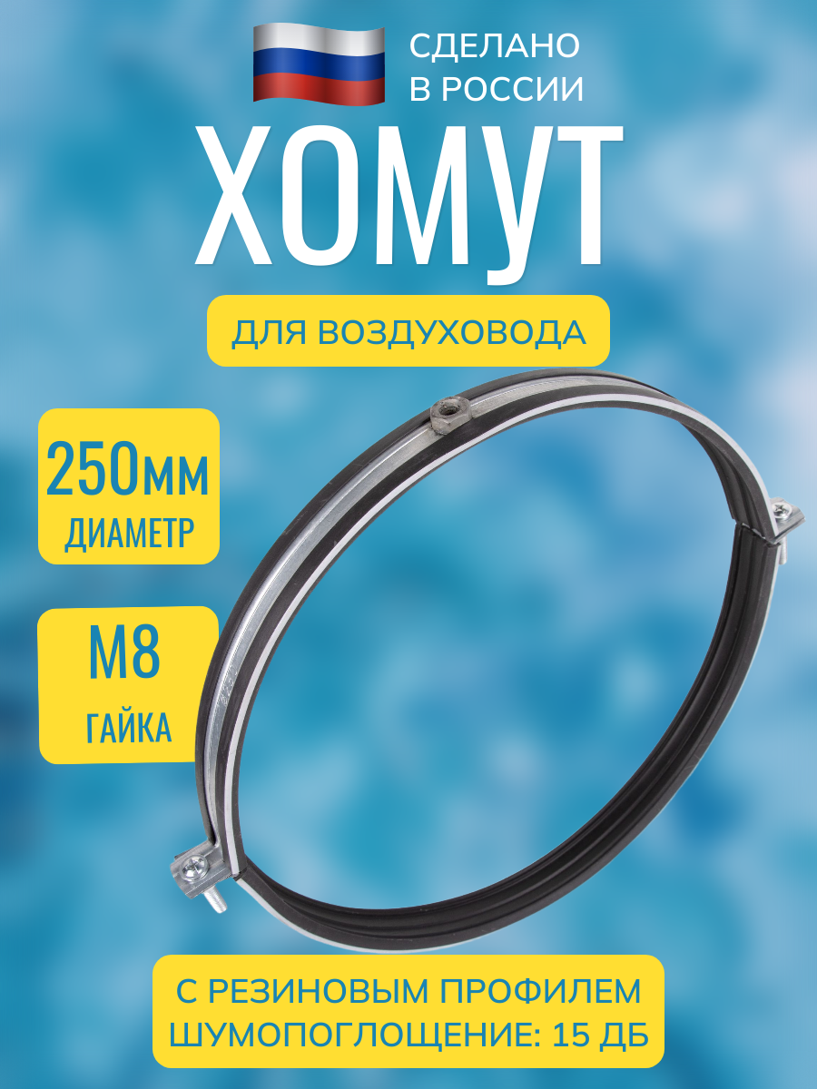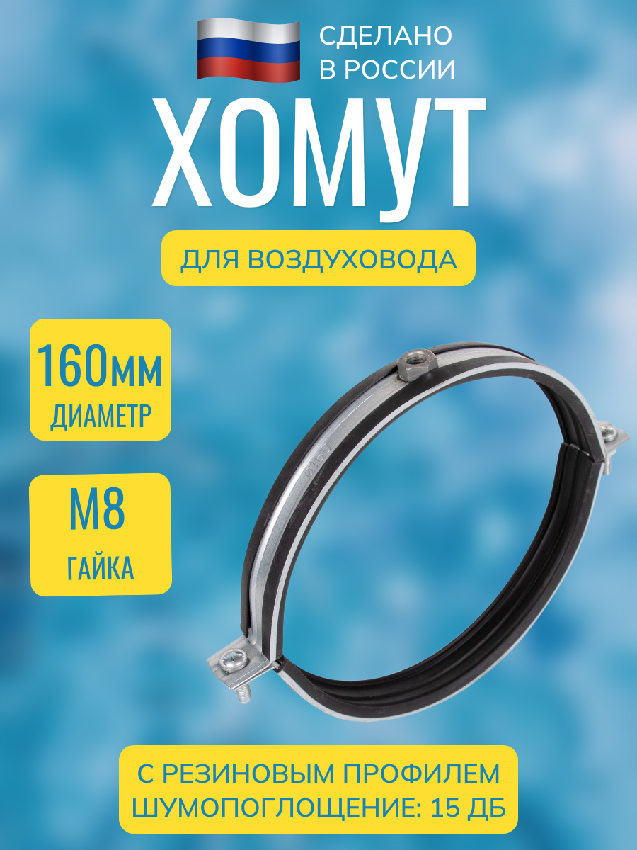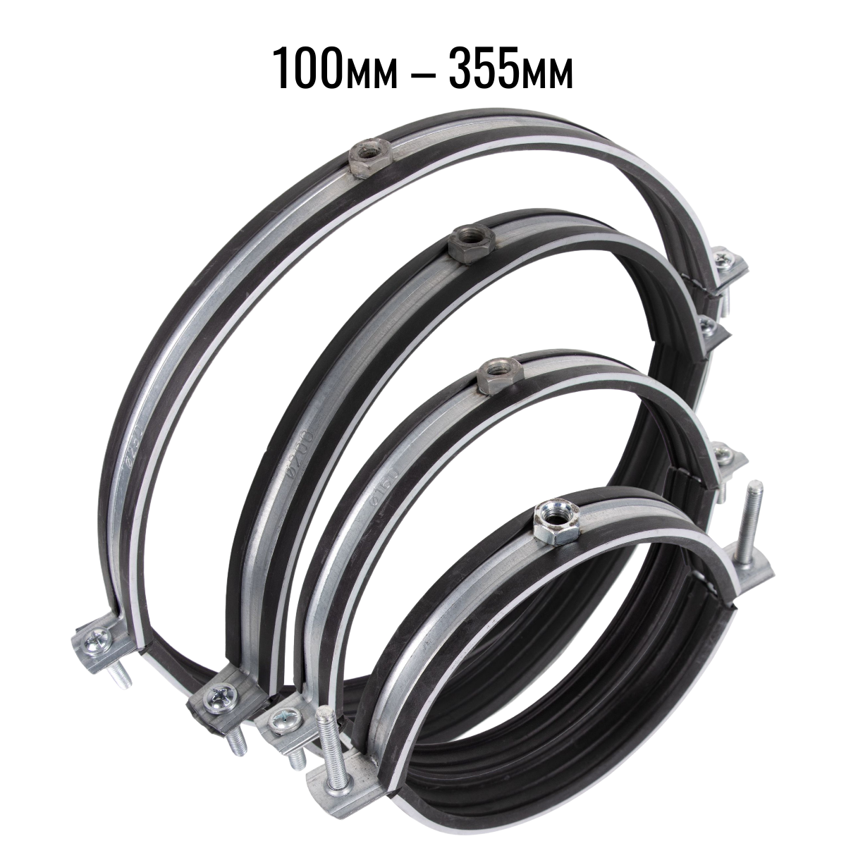 Хомут для воздуховода с резиновым профилем (ГАЙКА М8) применяется для крепления воздуховодов. Позволяет гасить акустические и механические вибрации, воздействующие на трубы. Изделия изготавливаются на основе гальванической оцинкованной стали, имеющей высокие показатели прочности. Применяемая в качестве уплотнителя резина обладает стойкостью к старению, поэтому их можно эксплуатировать в экстремальных температурных режимах. Толщина гальванизированного покрытия из цинка составляет порядка 8-10 мкм. Хомуты для вентиляции устойчивы к абразивному износу, не боятся прямого попадания солнечных лучей.