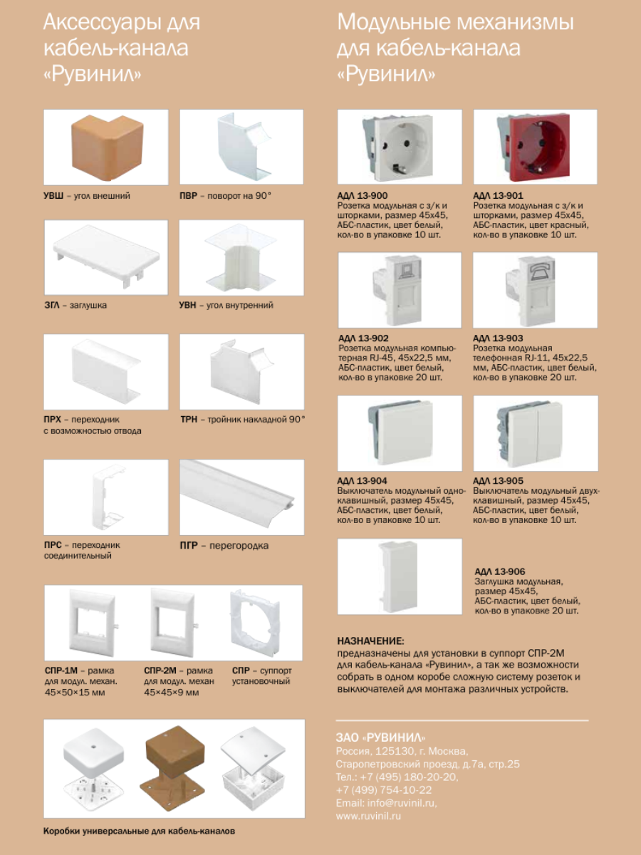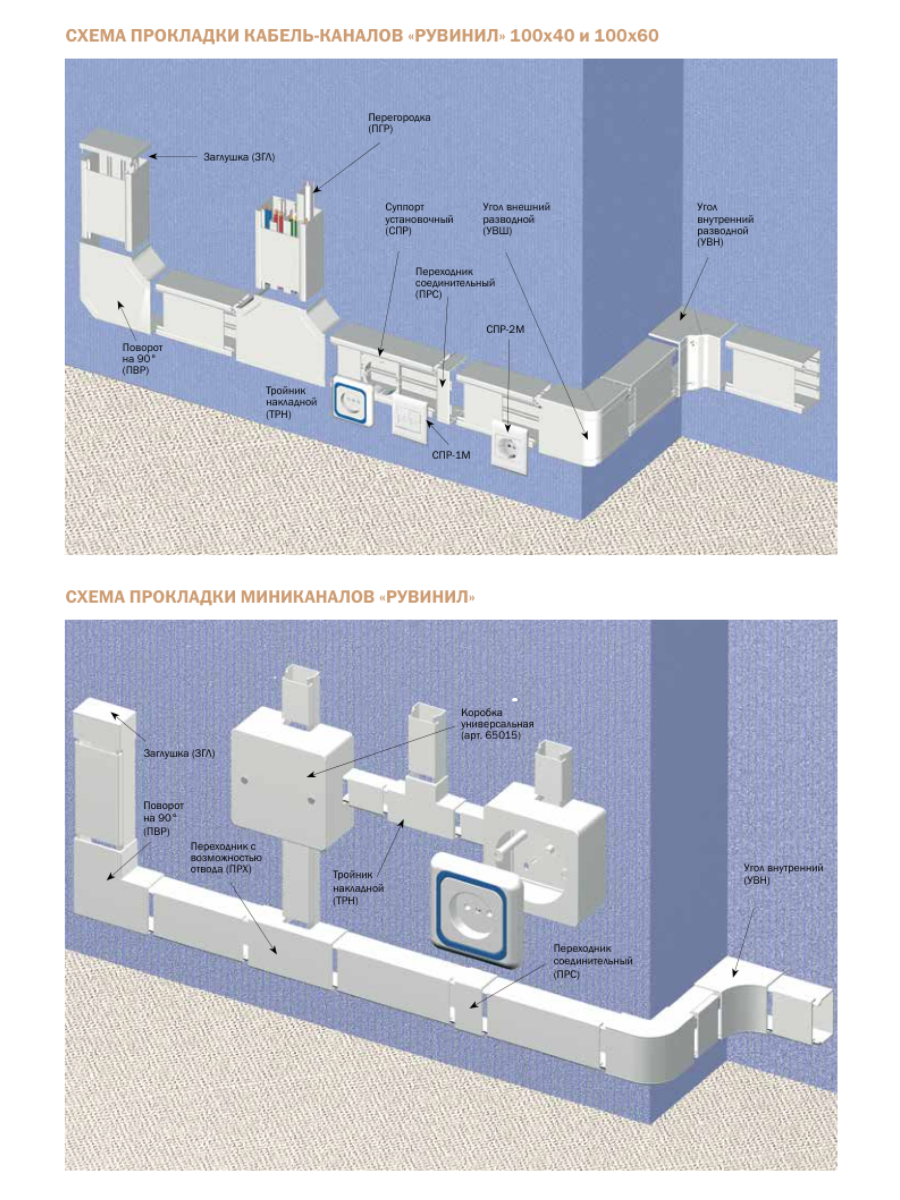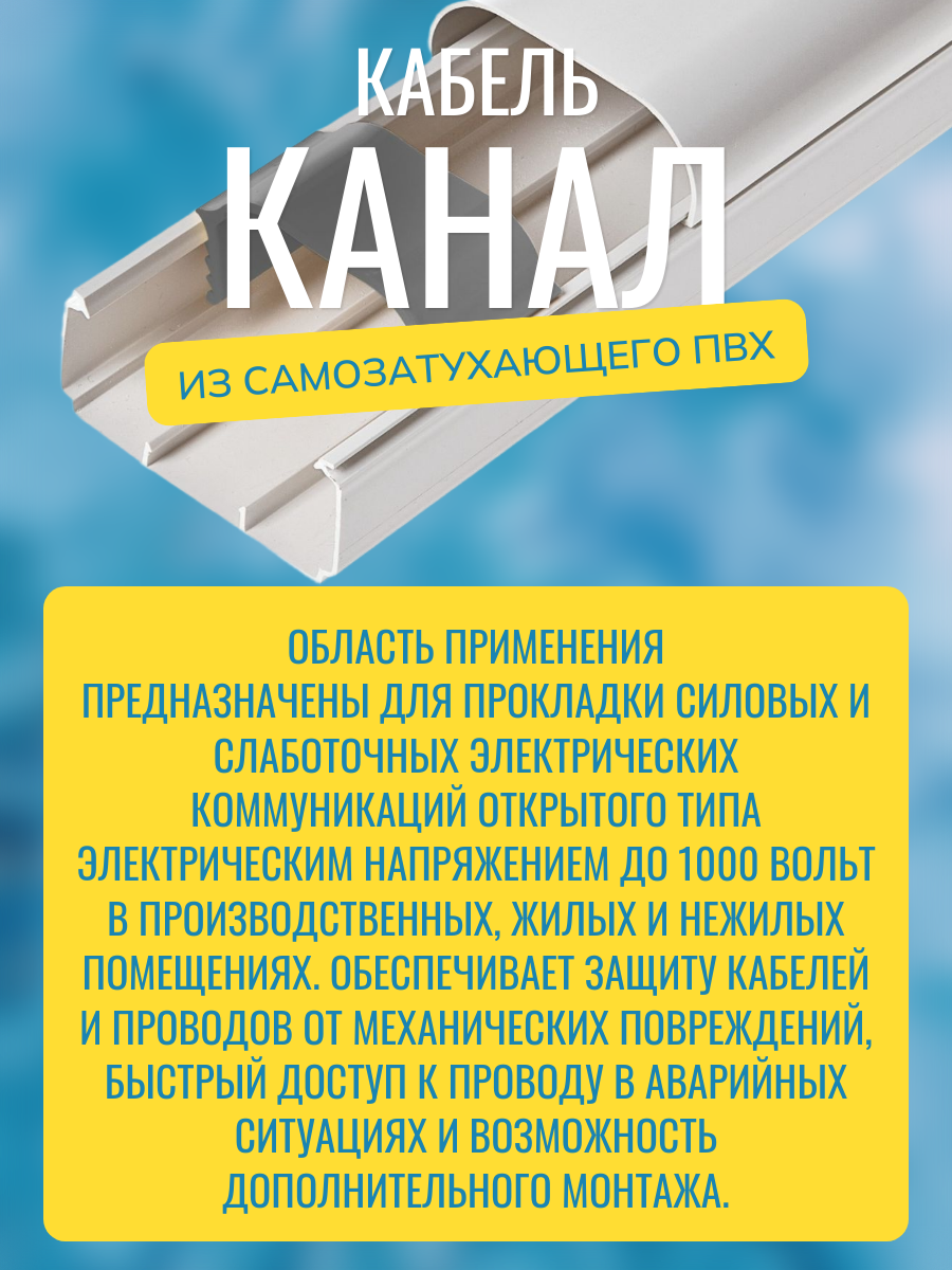 предназначены для прокладки силовых и слаботочных электрических коммуникаций открытого типа электрическим напряжением до 1000 Вольт в производственных, жилых и нежилых помещениях. Обеспечивает защиту кабелей и проводов от механических повреждений, быстрый доступ к проводу в аварийных ситуациях и возможность дополнительного монтажа.