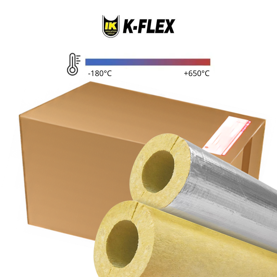 K-FLEX K-ROCK ALU S – негорючие цилиндры, кашированные алюминиевой фольгой. Применяются для теплоизоляции труб в помещении с повышенными требованиями к пожаробезопасности.