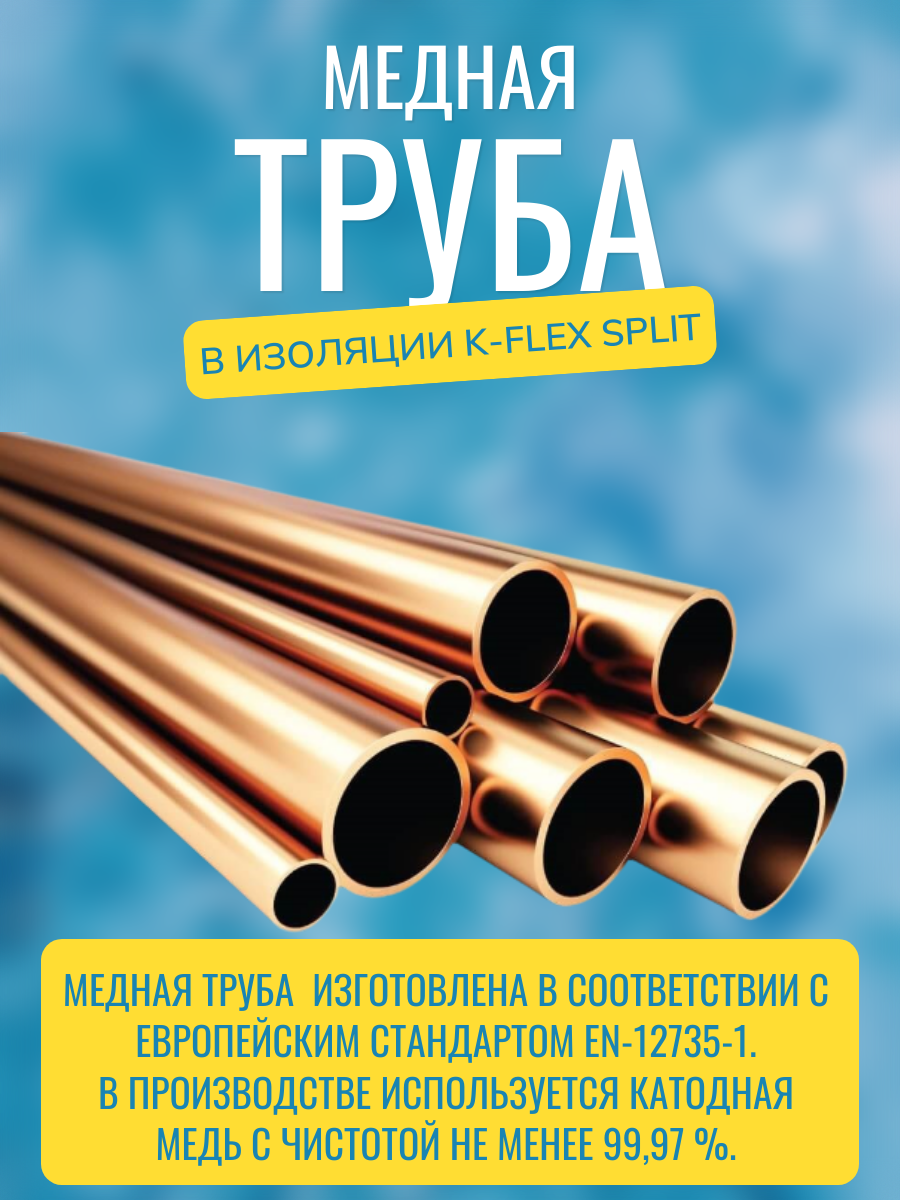 При монтаже оборудования систем кондиционирования воздуха, используются отожженые дюймовые медные трубы. Продукция производится в соответствии с европейским стандартом EN 12735-1. Содержание меди не менее 99,9%. Каждая бухта упакована в герметичную полиэтиленовую пленку и имеет на концах трубы заглушки, для исключения попадания внутрь пыли и грязи. На поверхности трубы нанесена заводская маркировка с техническими характеристиками. Количество метров в упаковке: 15.