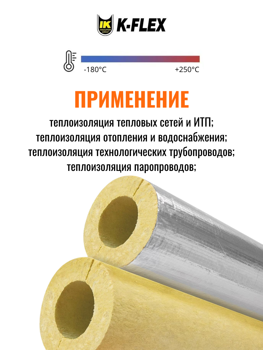 K-FLEX K-ROCK ALU — цилиндры изготавливаются с внешним покровным слоем в виде алюминиевой фольги армированной стеклосеткой. Допускается применять для изоляции трубопроводов расположенных внутри помещения.